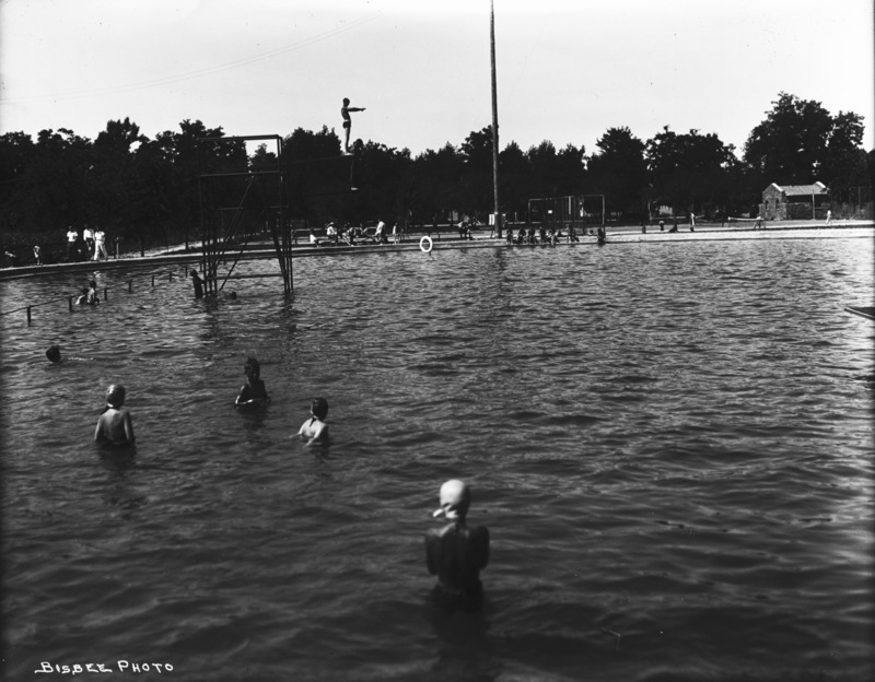 - Harmon Park; the swimming pool with diving platform, boards, and swimmers.