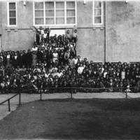 - A large group of children at the side of a school posed for a photograph.
