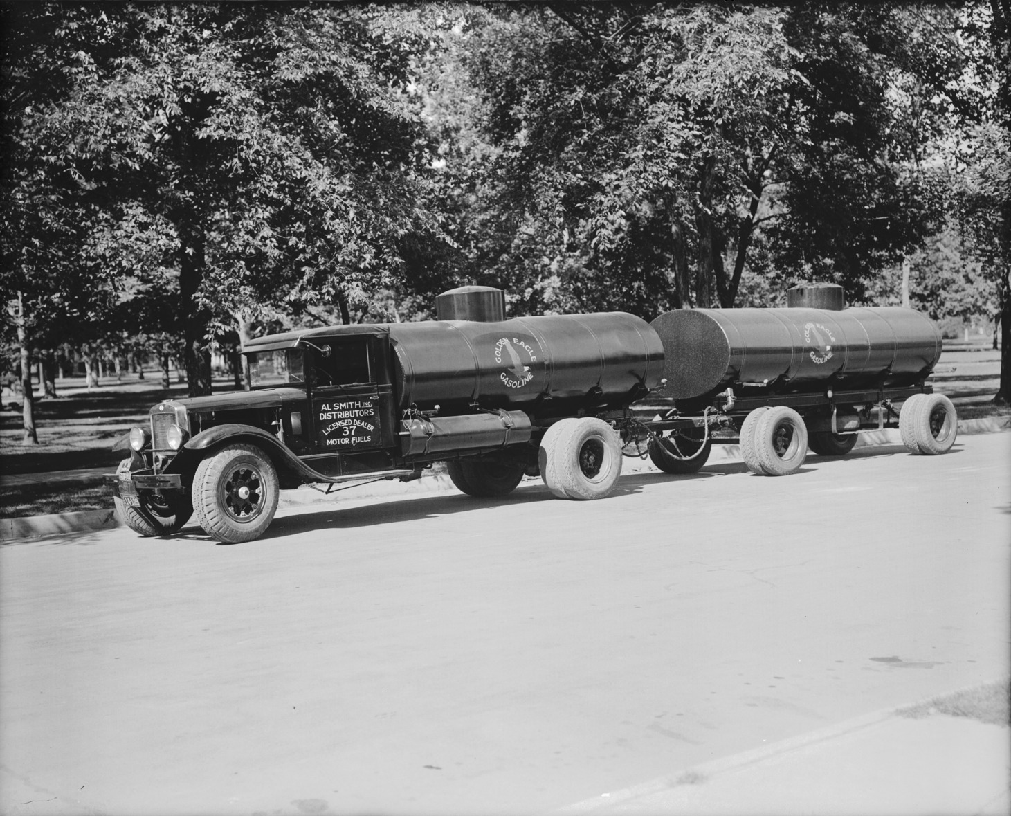 - A truck labeled Al Smith, Inc., Distributors, hauling gasoline; parked before area with large trees.