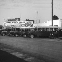 - Seven Warberg Transfer Company trucks parked below a large sign for Covey Gas and Oil Company.