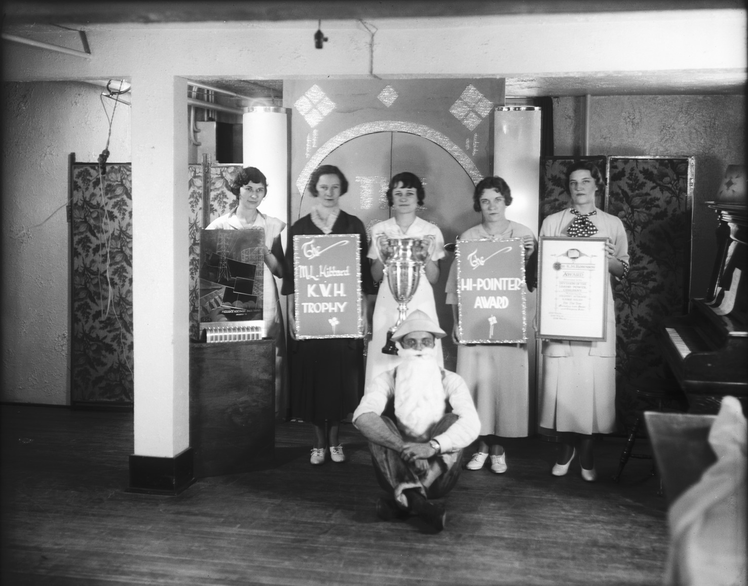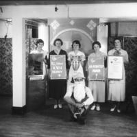 - Six cast members of an amateur theatrical, standing on a stage set.