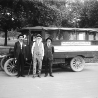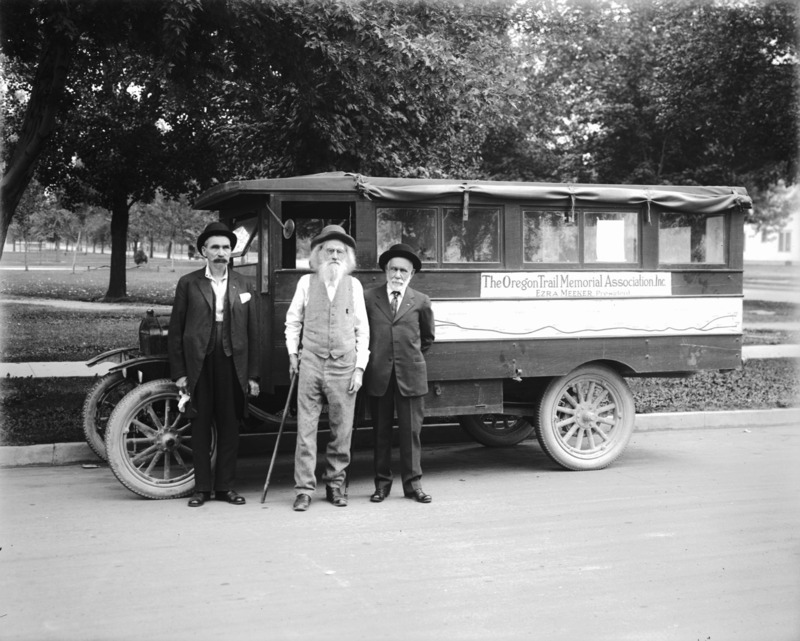 - Ezra Meeker and two unidentified men beside a covered truck, labeled Oregon Trail Memorial Association, Inc. 1916