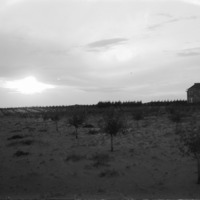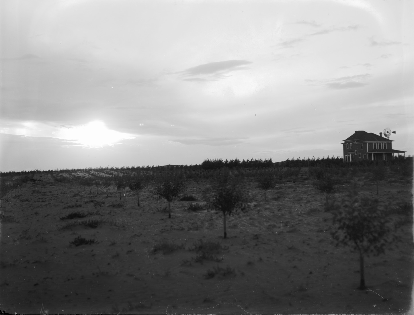 - A sunset view of a homestead, with trees in the foreground.