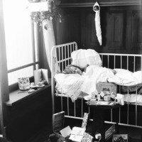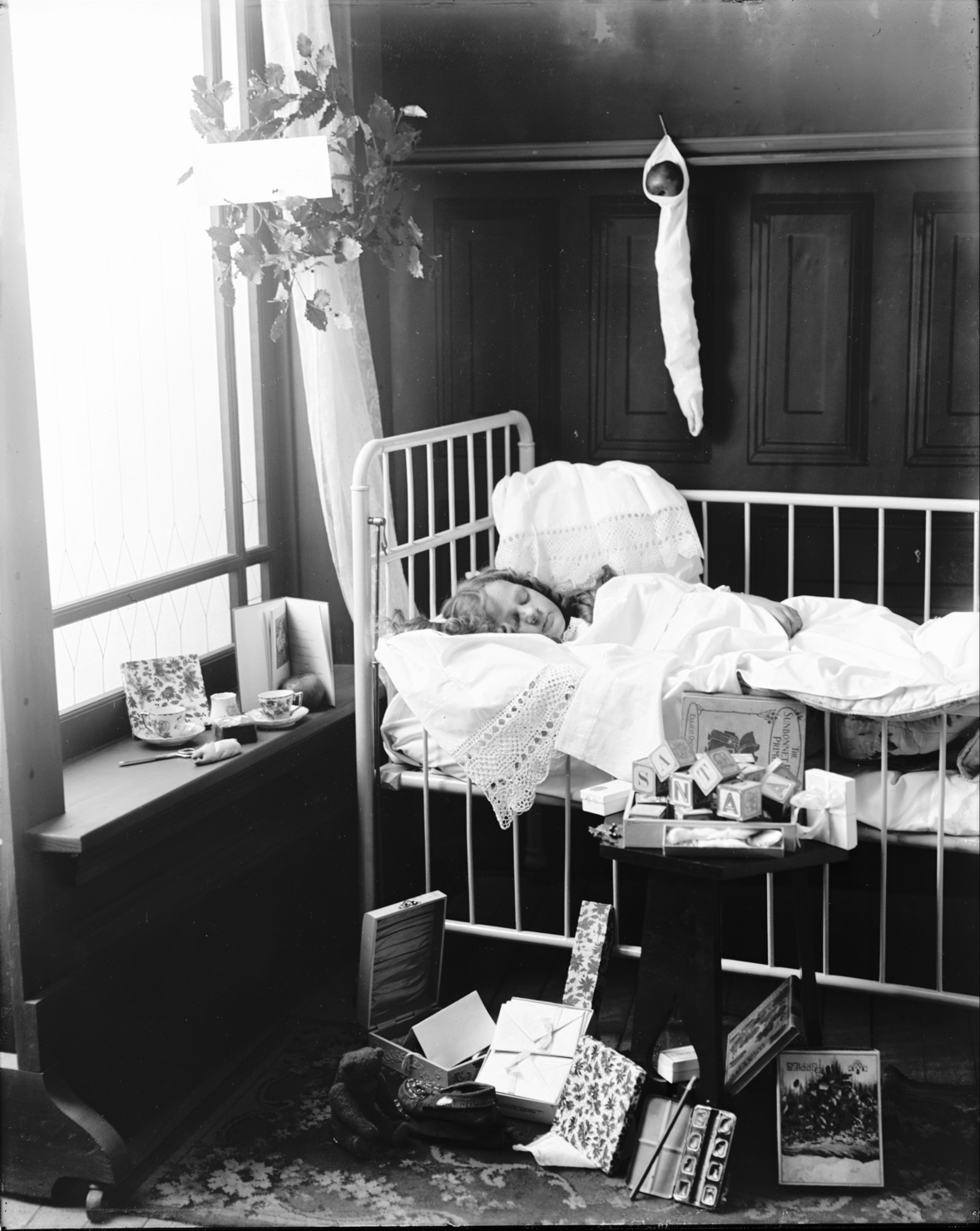- A little girl asleep in a crib. Christmas Scene. Christmas Theme Photoshoot