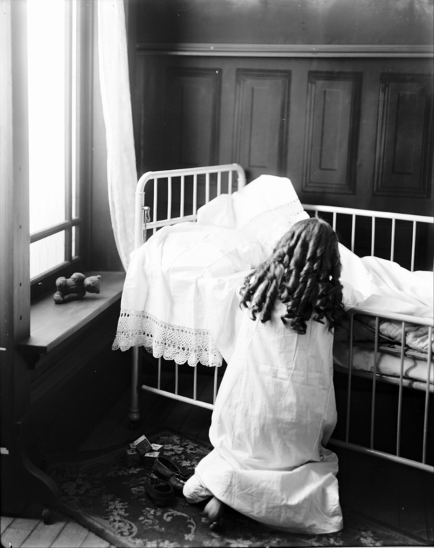 - A child (girl) at prayers beside crib. Christmas Theme Photoshoot