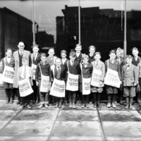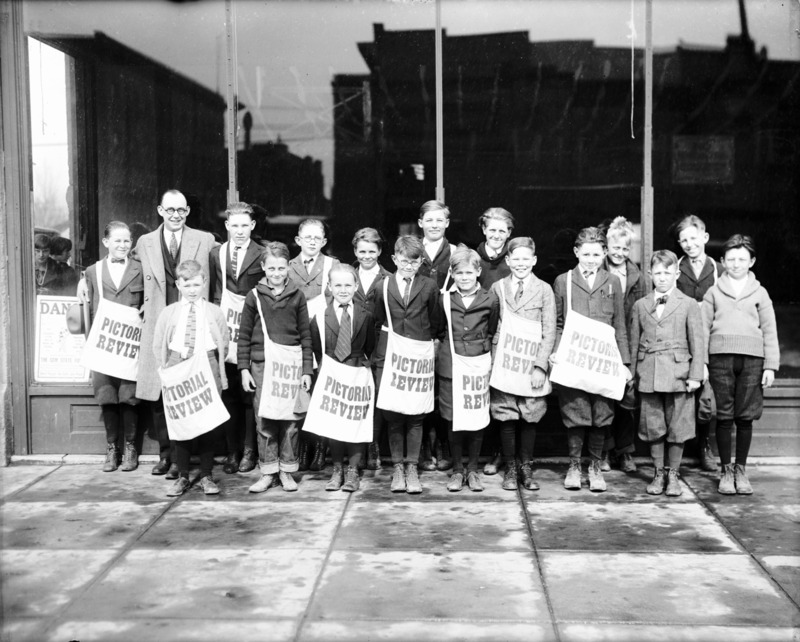 - A group of newsboys posed in front of a building, with bags marked Pictorial Review.