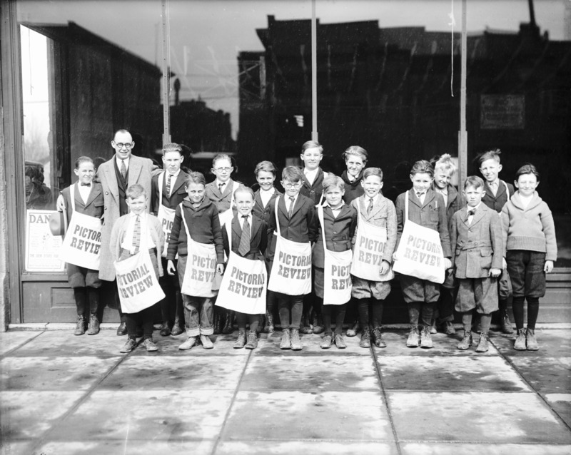 - A group of newsboys posed in front of a building, with bags marked Pictorial Review.