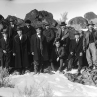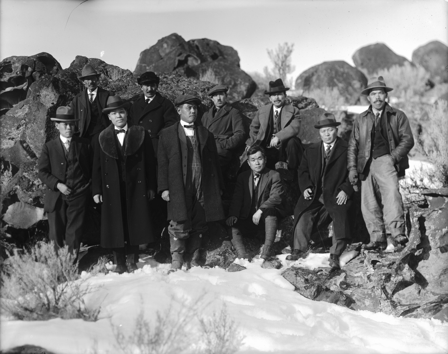 - A group of Japanese men posed among lava rocks and snow in a canyon area. First row: first from left is Eddie Tanaka; second from left with shawl collar is Ray Tanaka or Tom Koto, Sr; first from right is Kaichi Shiozawa.