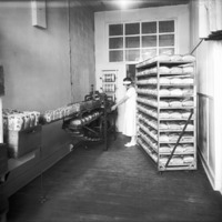 - A woman working amid loaves of bread and bakery equipment.