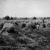 - "4 acres of oats - 500 bushels. Grown by David Jinks on M.E. Finch Ranch;" man, a young girl, and a dog in a field.