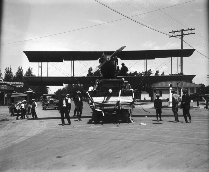- An airplane sits on a truck decorated for a parade, several men and boys walk alongside.