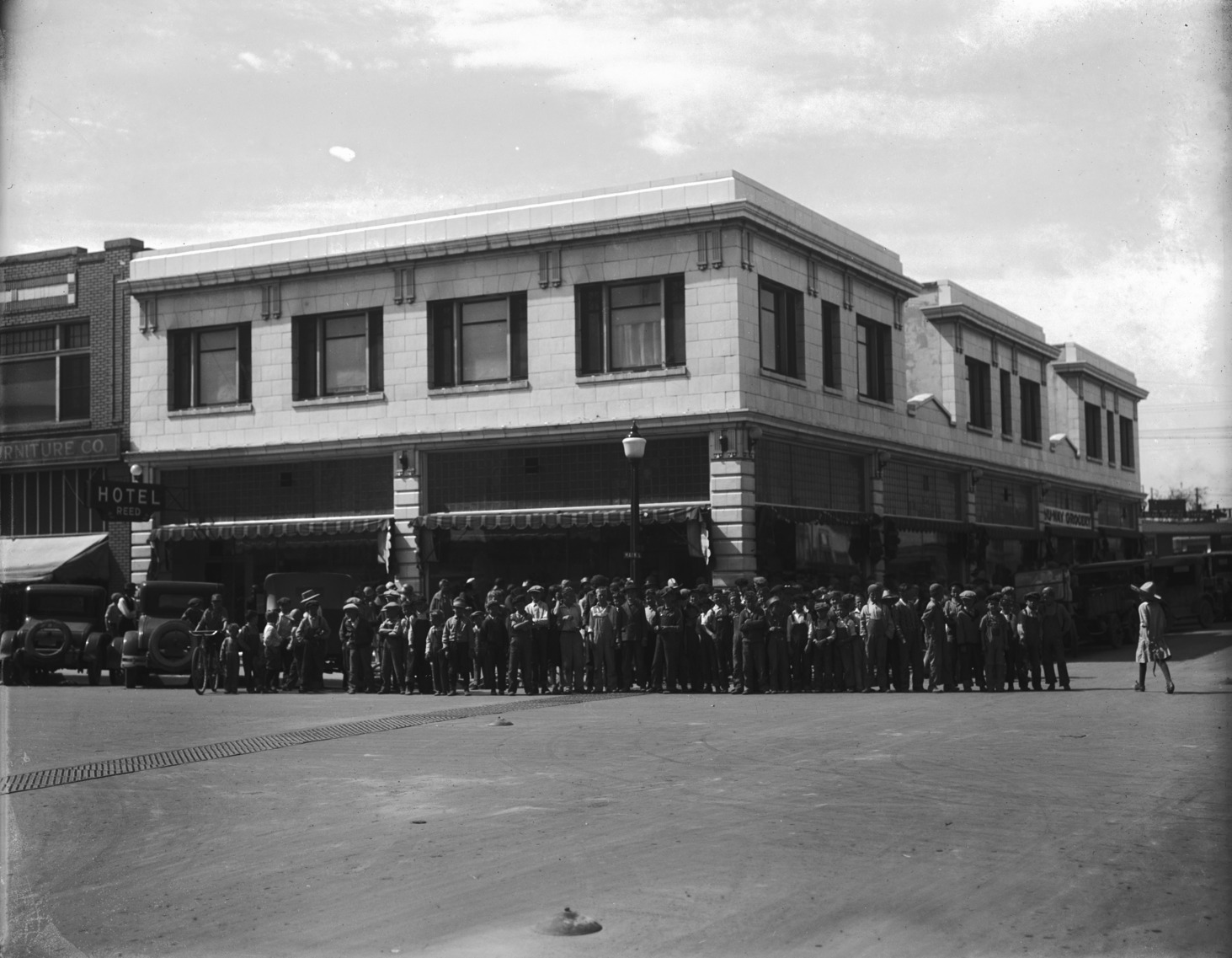 The Big White Store, looking south on the corner of Main St S and 2nd St S (now Hansen St S); with a large crowd of children on the sidewalk in front of the building. A sign on the 2nd St S side of the building reads "Nu-Way Grocery;" also visible is a sign for Hotel Reed; Hoosier Furniture Store is on very left.
