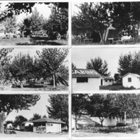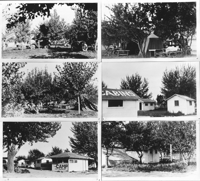 - A collage of six photos of a tourist camp, with tents, cabins, automobiles set among trees.