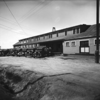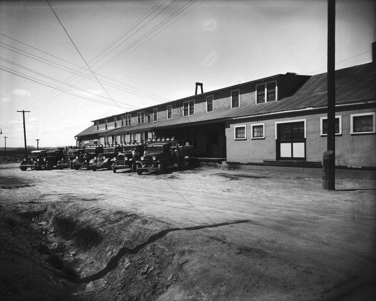 - Seven delivery trucks at the Jerome Cooperative Creamery building. Men stand beside some of the trucks.
