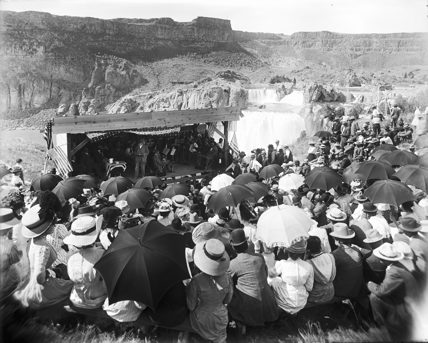 - A large group of people at Shoshone Falls, listening to Ezra Meeker speak on Flag Day, 17 June 1910. Meeker, other dignitaries, and an orchestra sit beneath a covered platform.