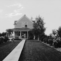 - A two-story frame house, with a manicured lawn and landscaping. A family of seven is posed on the porch and lawn. An outhouse is visible in background on left.