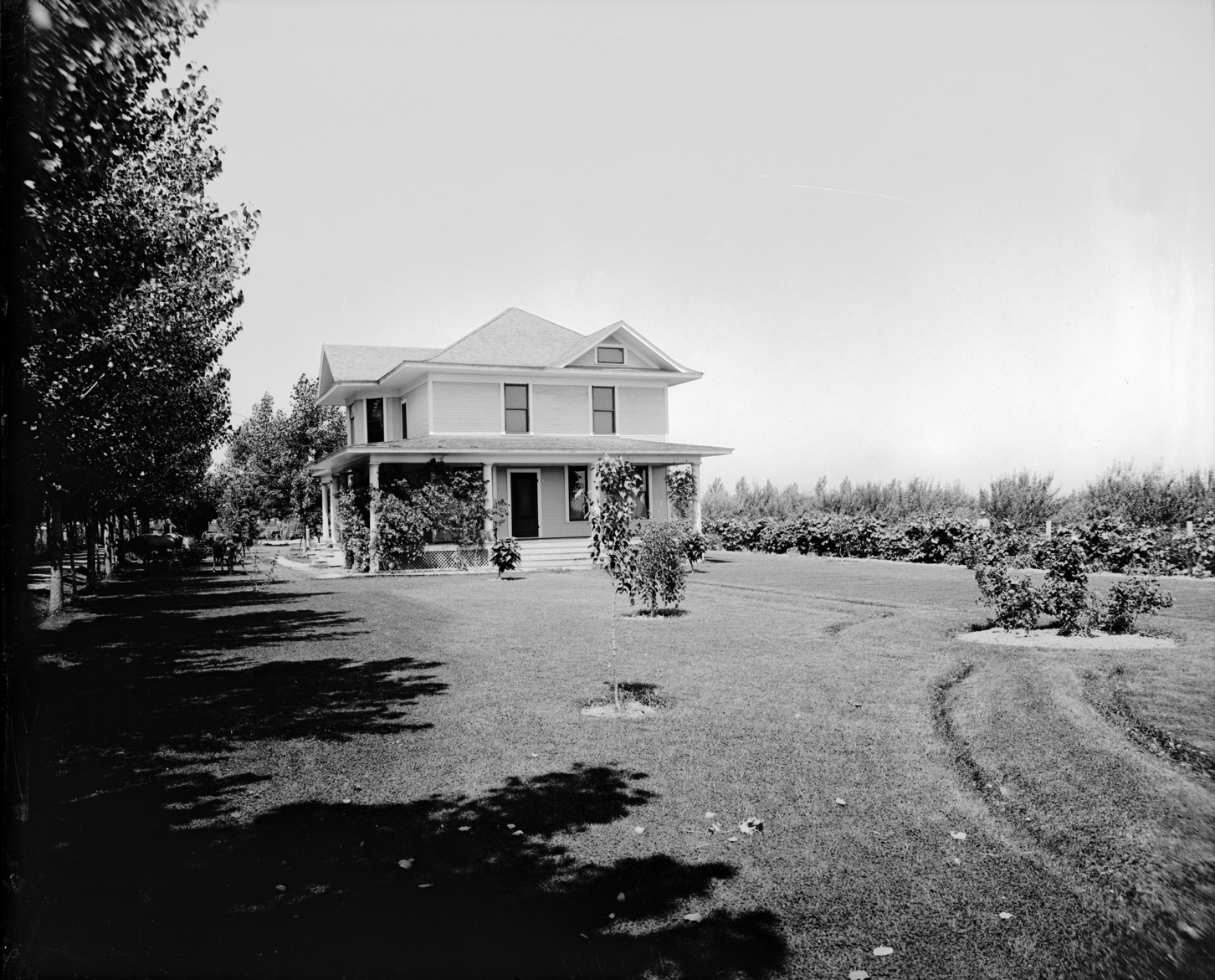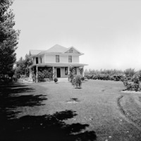 - C. Harder house on Blue Lakes Blvd; a man stands among the berries on the right, and a child stands with cows on the left.