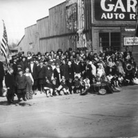 - A large group, including children, stands outside a garage and auto repair building; a few of the adults wear Salvation Army insignia. A sign over the storefront reads "Van Court-Ebersol Auto Repairing - Welding."
