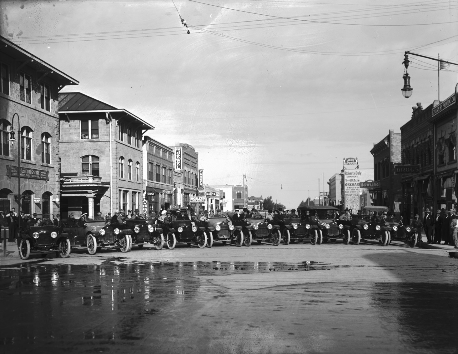 Ten Buick automobiles with riders and drivers park across Main Street in front of the Perrine Hotel. Businesses seen: Rexall Drug Store, Hatter, Ladies and Gents Shine, Alco Clothes Shop, The Jewel, Grocery, Hickler's Cash Store, Varney Candy, Cafe, Independent Meat Market, The 5 and 10 Cent Variety Store, Light and Power, Roberts-Daly Company Bowling, Cotillion Hall, Drugs, Kingsbury Printing Company