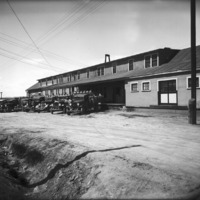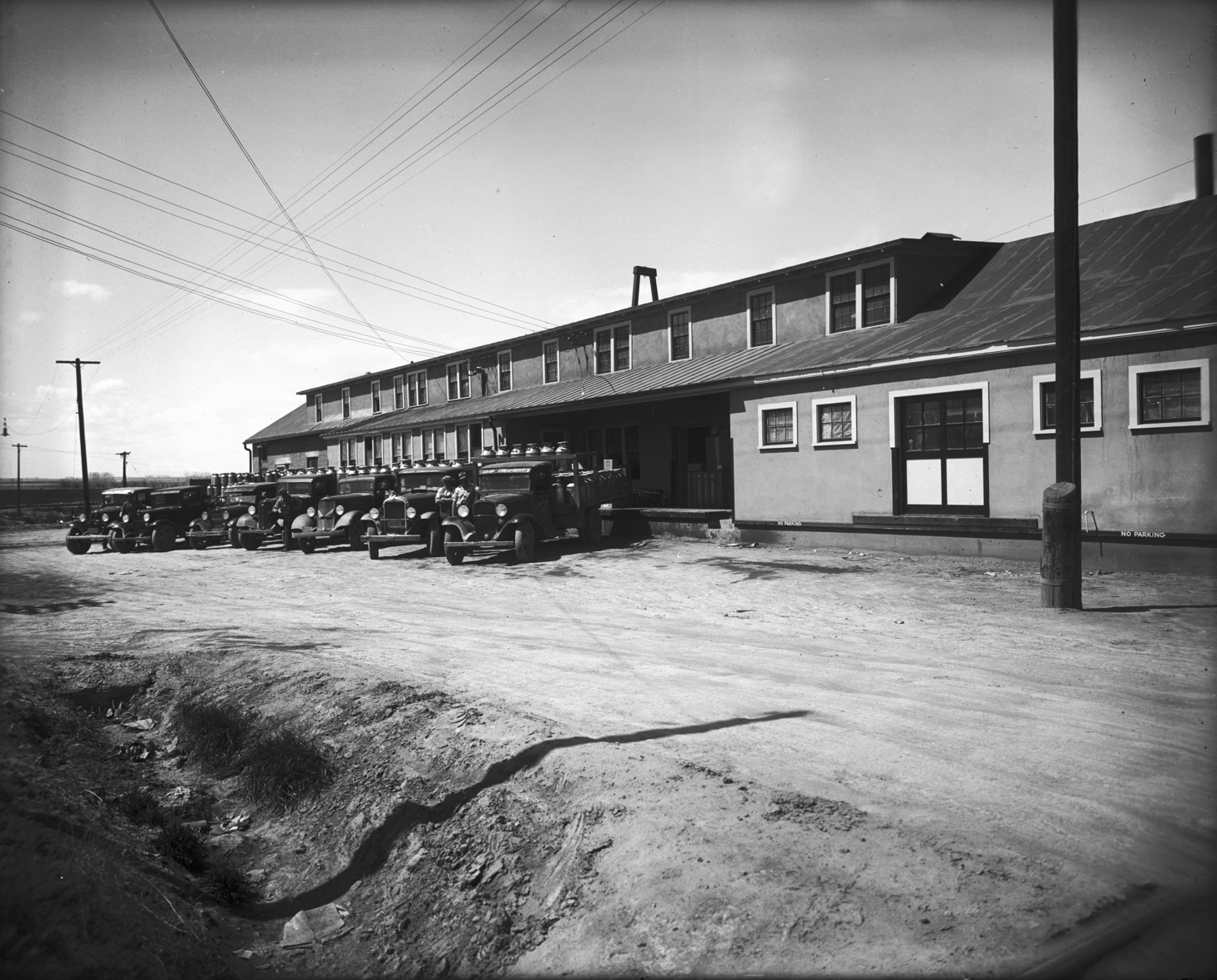 - Seven delivery trucks at the Jerome Cooperative Creamery building. Men stand beside some of the trucks.