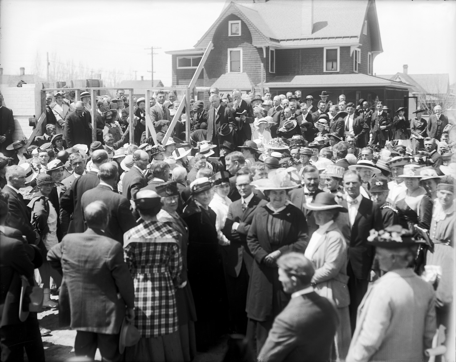 A large group of people gathered at a construction site, most likely when the cornerstone for the new Presbyterian Church was laid in May 1917. The house in the background is the Babcock House, which was sold to the Presbyterians when they purchased the corner lot next it. The house was used as the Presbyterian Manse until; 1952, when it was moved to the corner lot at 204 Harrison St.