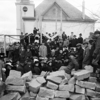 - Crowd of people gathered to celebrate laying the cornerstone of the addition to the Methodist-Episcopalian Church (original church building in background).