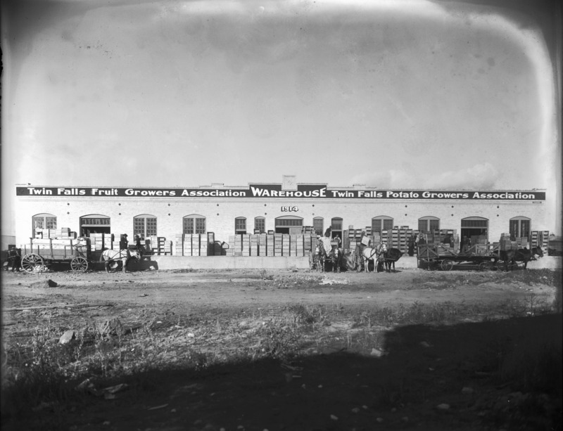 Twin Falls Fruit Growers' Association and Twin Falls Potato Growers Association Warehouse; wagons with teams of horses waiting to load or unload; crates fill the area in front of the building; 1914, the year the building was constructed is painted above the middle entrance