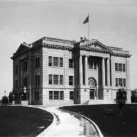 - Twin Falls County Court House; a man is mowing the lawn at the left.