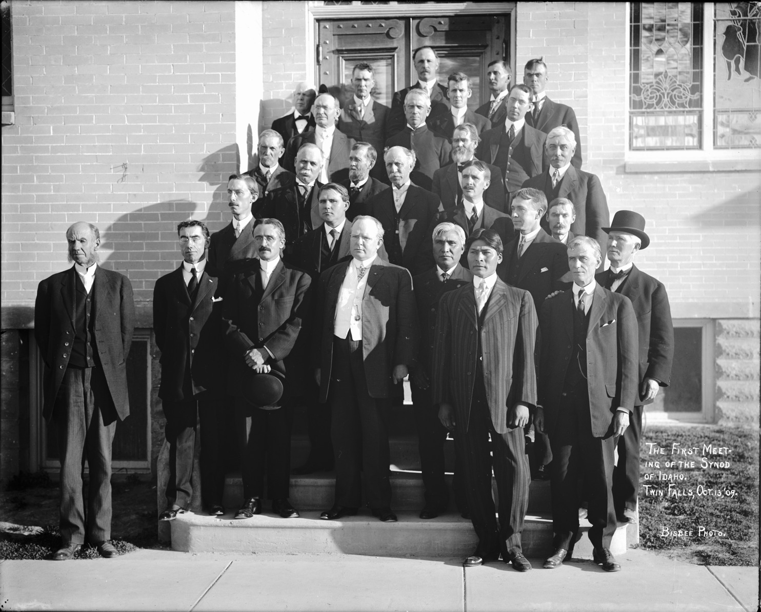 - "The First Meeting of the Synod of Idaho. Twin Falls, October 13, 1909;" group of men standing on the steps of the Presbyterian Church.