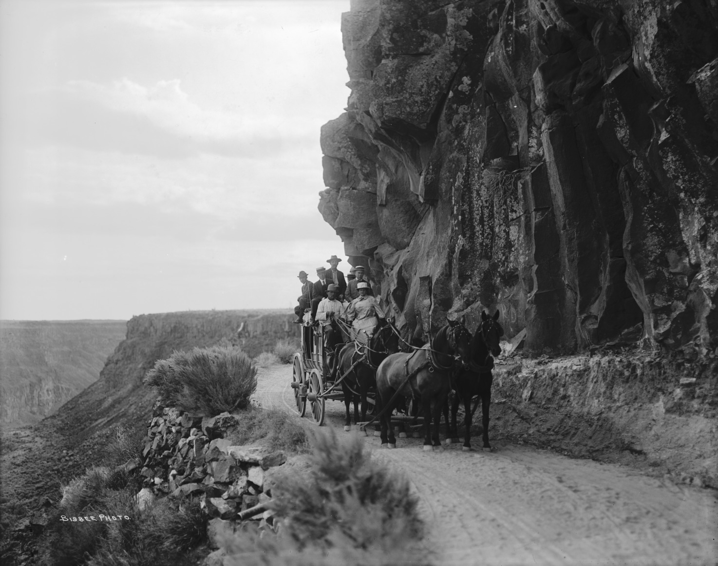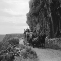 - Several people on a stagecoach, going down a grade into the Snake River Canyon.