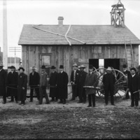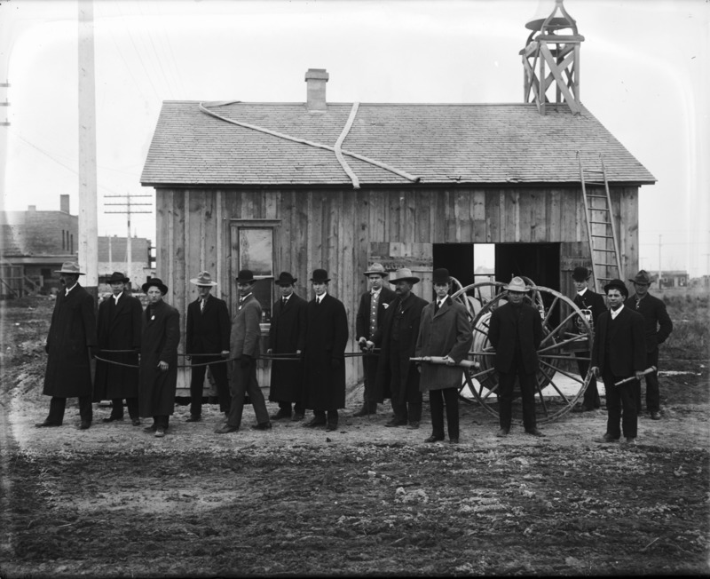 - Twin Falls Fire Fighters; fifteen men with hand-operated pumper, standing before a small frame building.