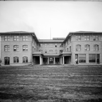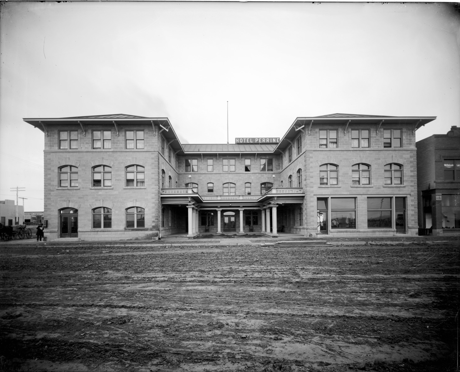 - Front view of the Hotel Perrine, barbaer shop patrons can be seen through window on right. A horse and buggy are at left, as is a man standing at the corner. Snake River Implement Company in back on left.