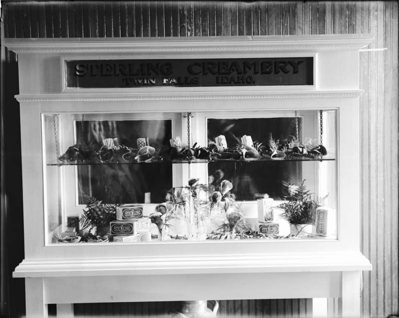 - A display case with the products of the Sterling Creamery, including flowers sculpted of butter.