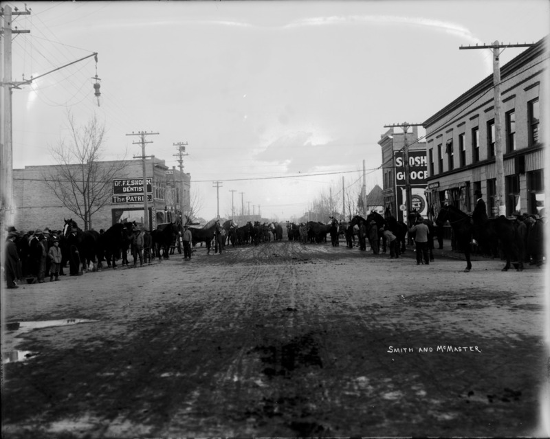 - "Smith and McMaster;" Horses and men lined up on Shoshone Street in Twin Falls, Idaho. Also visible: Shoshone Grocery; Methodist Church; Dr. F.E. Snook, Dentist; The Patrie, Orpheum; part of the sign for the Lyric Theater