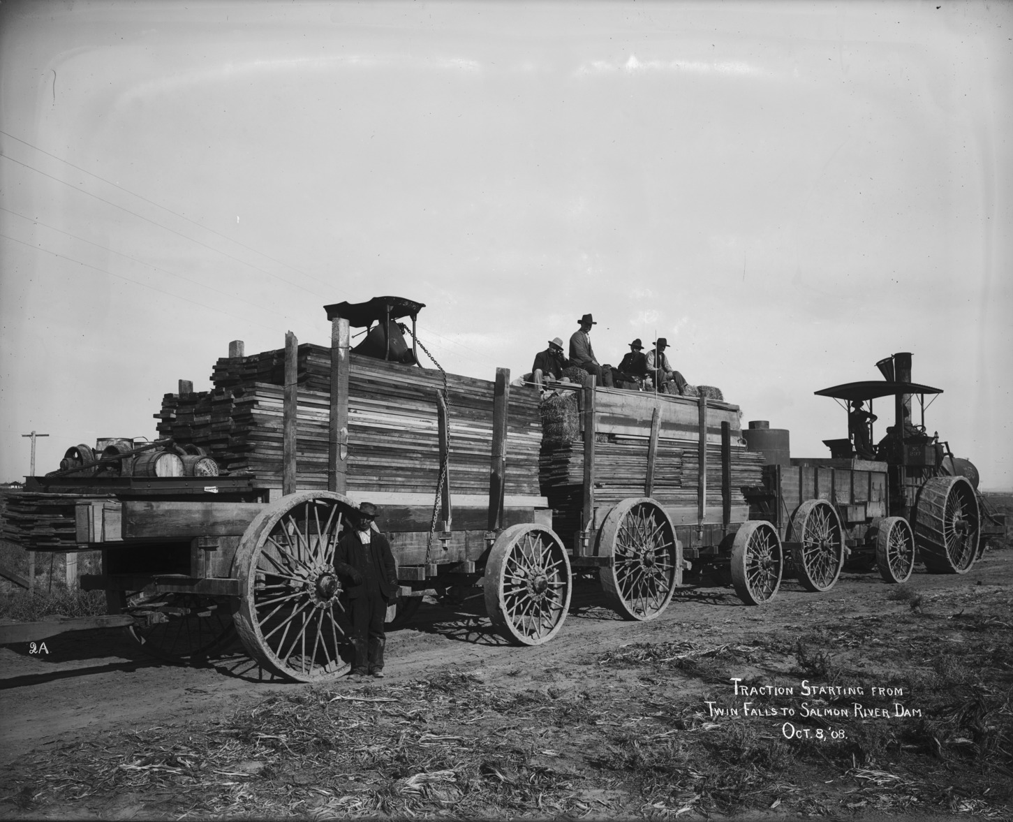 - "Traction starting from Twin Falls to Salmon River Dam; October 8, 1908;" a steam tractor pulling three cars packed with construction materials; four men are perched atop the materials, with another man at the tractor and one standing in the road