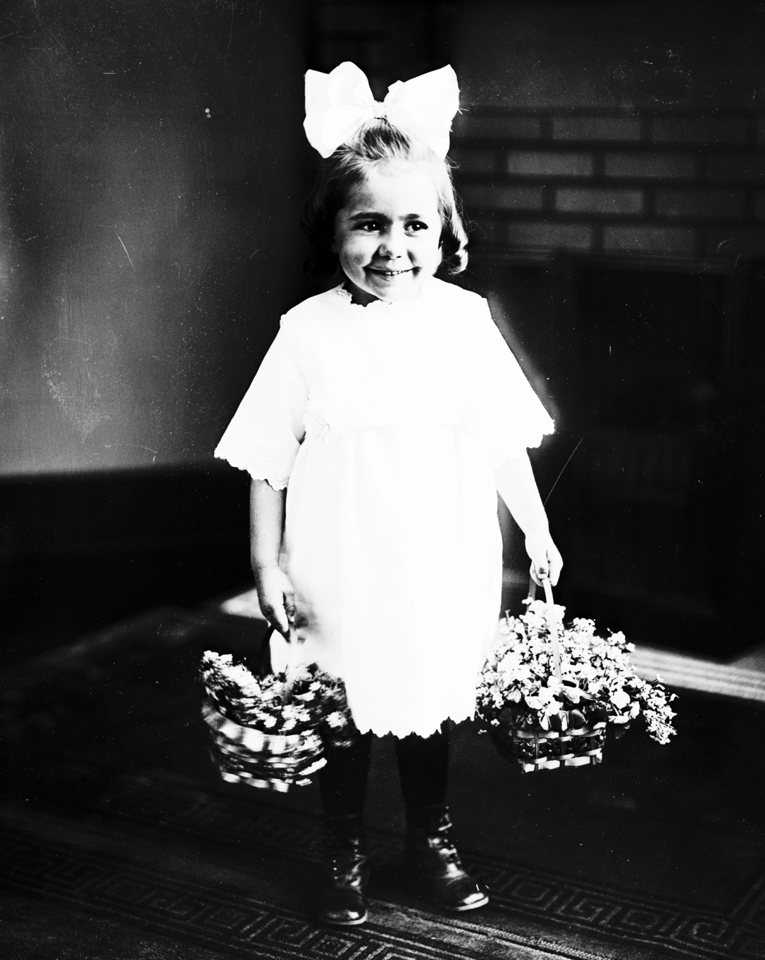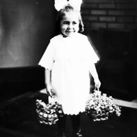 - Portrait of a young girl with a large bow in her hair, holding two baskets of flowers.