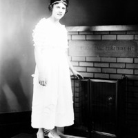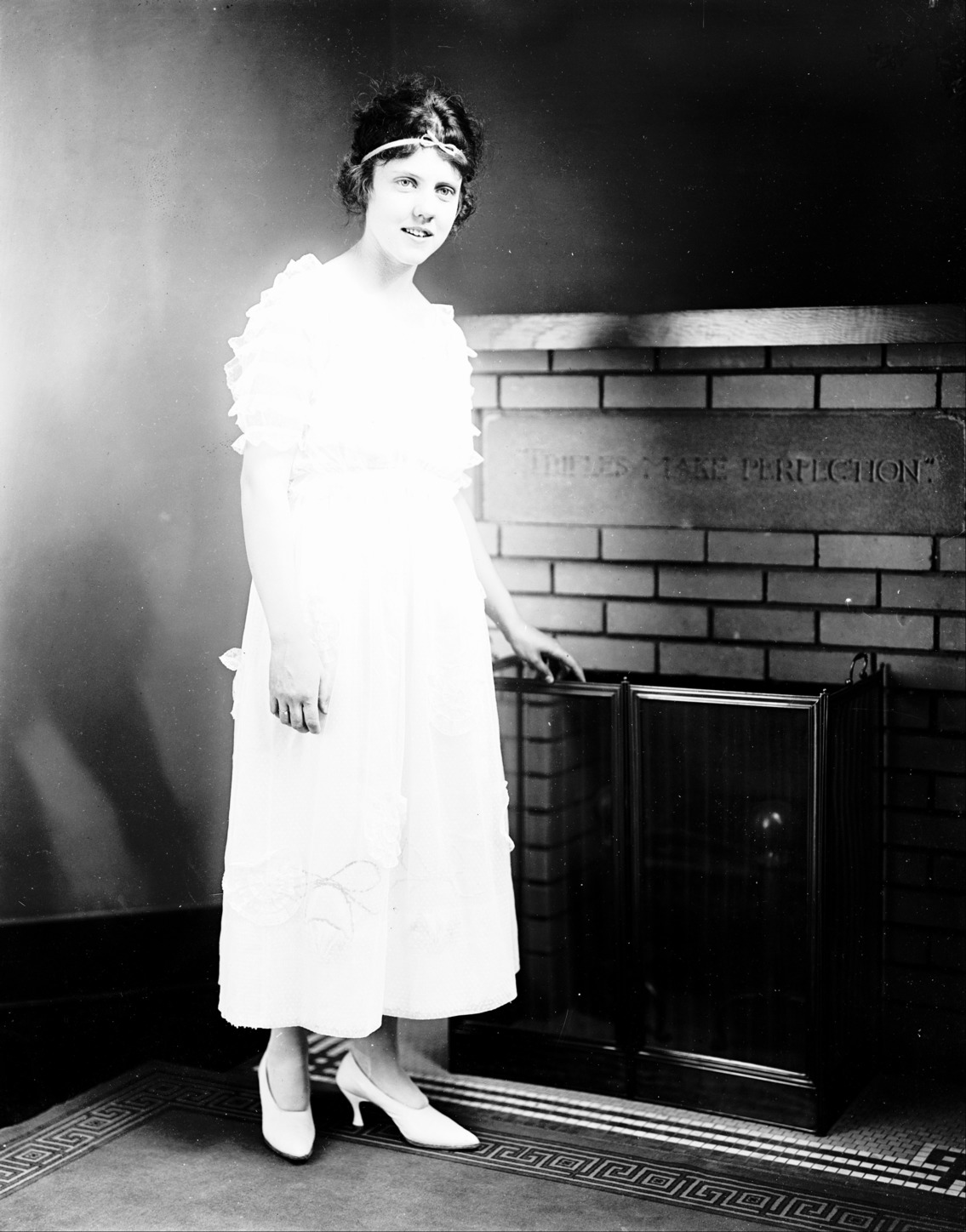 - Portrait of a young woman standing next to a fireplace in the Bisbee Studio.