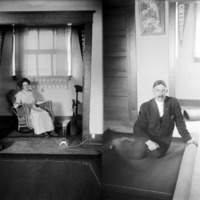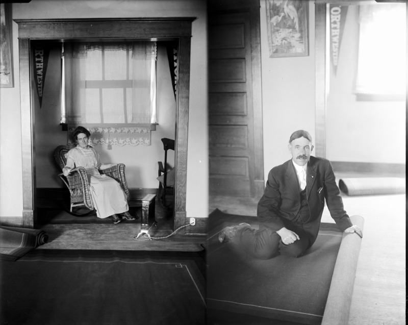 - Two portraits of Clarence and Jessie Bisbee posing in the Bisbee Studio. Jessie is deated in a rocking chair beneath a window; Clarence is seated on the floor with rolled carpet.