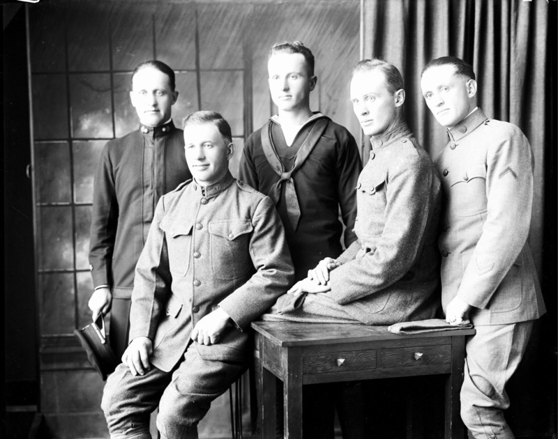 - Portrait of five men in military uniforms.