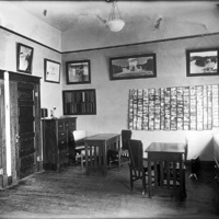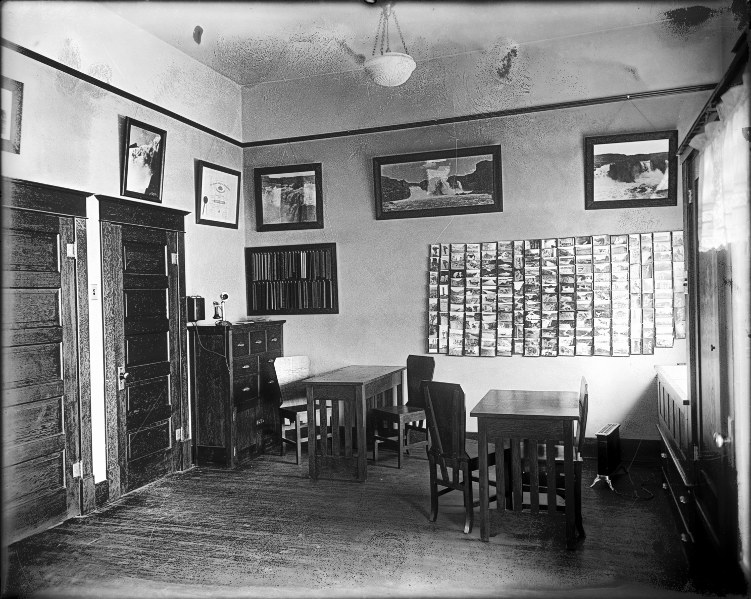 - Interior of the Bisbee Studio consulting room, with postcard racks on the wall and several tables and chairs.