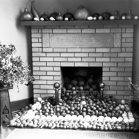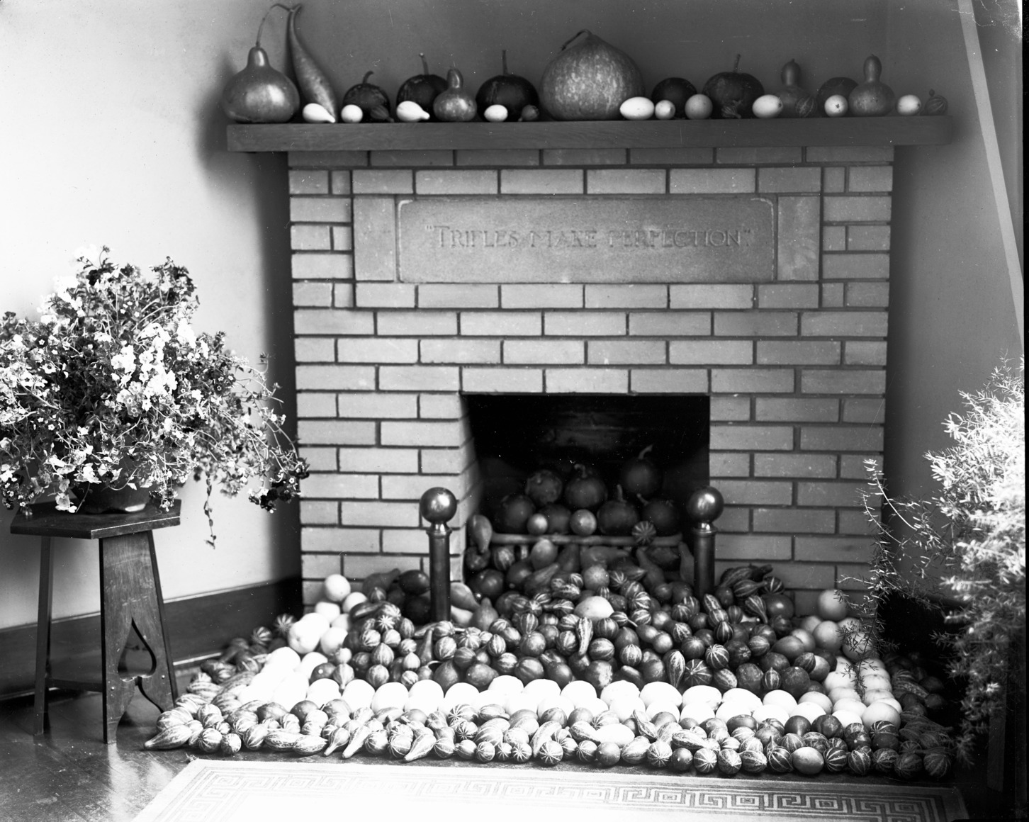- Autumn display of gourds in front of one of the fireplaces in the Bisbee Studio. An embedded epigraph reads, "Trifles Make Perfection."