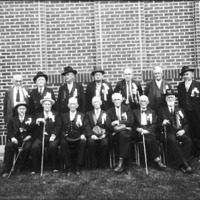 - A portrait of fourteen older men wearing ribbons. They are standing and seated in front of a brick building, most likely the American Legion building.