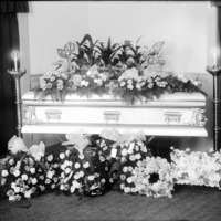 - Coffin surrounded by flowers and two large candlesticks.
