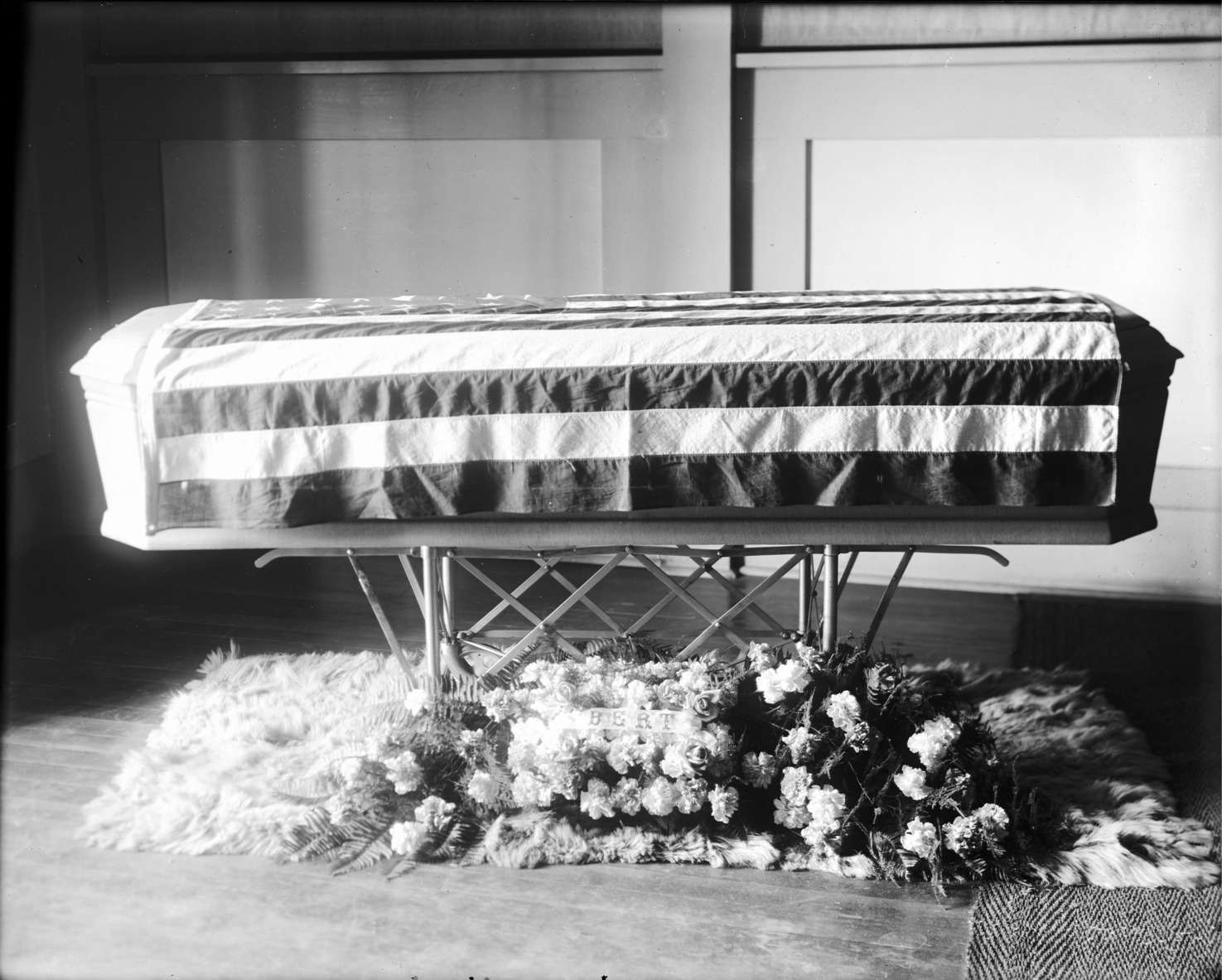 - Flag-draped coffin, flowers displayed beneath with a ribbon reading "Bert."