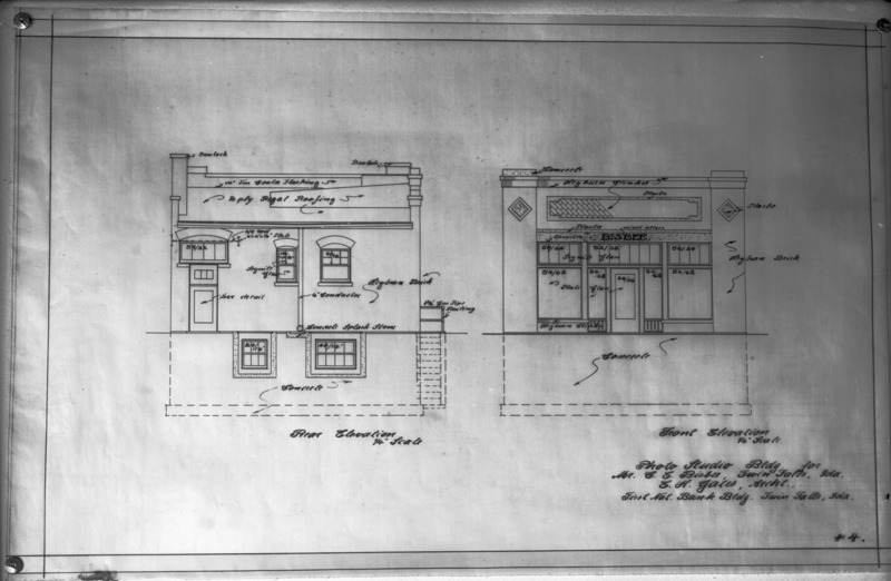 - Blueprints for the front and rear elevations of the Bisbee Studio. Plans drafted by Twin Falls architect Ernest Gates.