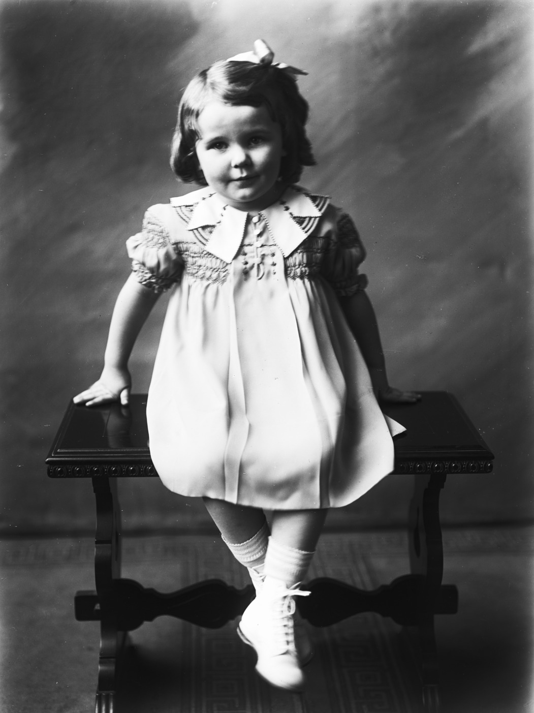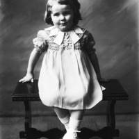 - Portrait of a little girl, seated on a bench.