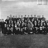 - Large group of mostly young people posed in front of the original First Christian Church.