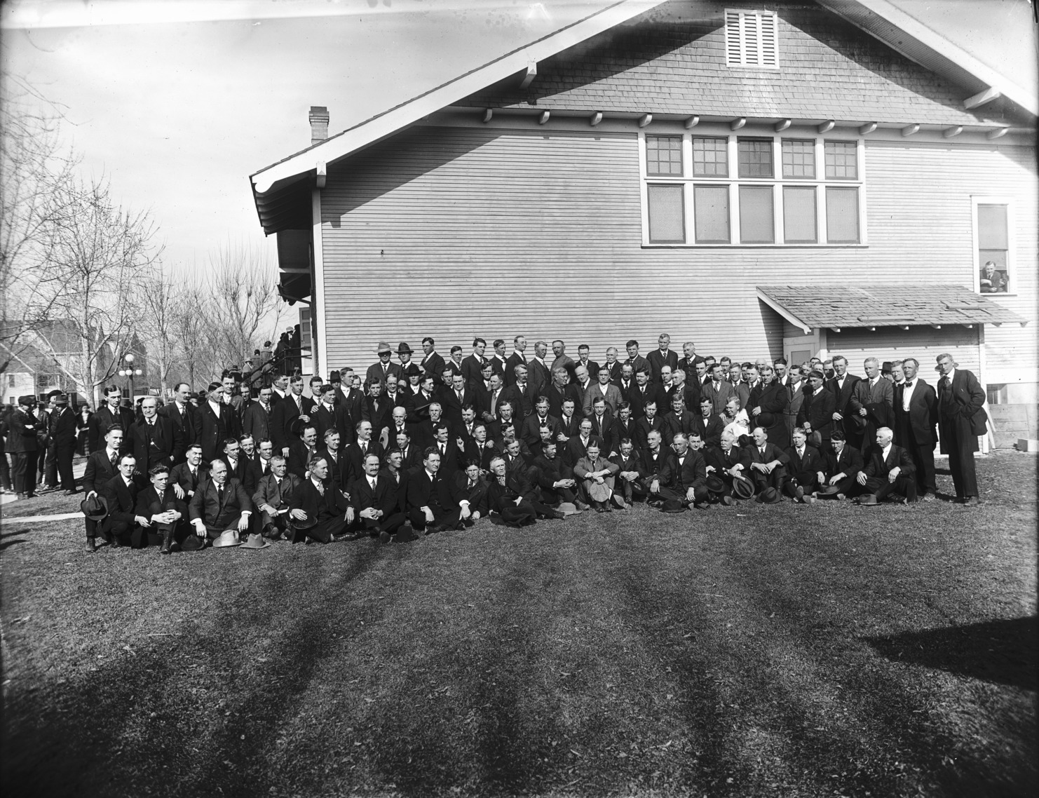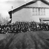 - Large group of men posed in front of the original First Christian Church. The Methodist Church can be see in the background at left.
