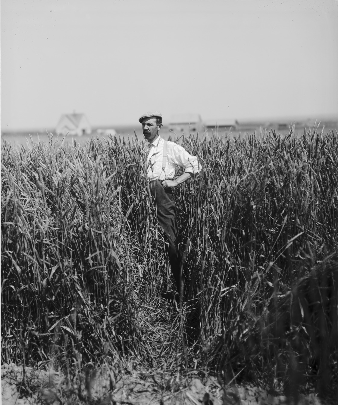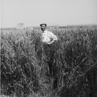 - Clarence Bisbee standing in a field of shoulder-high grain.
