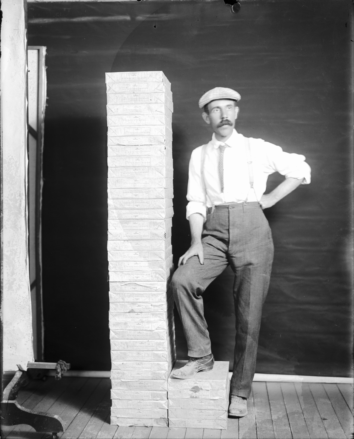 - Clarence Bisbee stands beside glass-plate negative boxes.